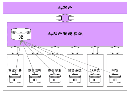 電信企業(yè)大客戶(hù)管理系統(tǒng)是電信企業(yè)信息系統(tǒng)中的一個(gè)組成部分,與其它業(yè)務(wù)系統(tǒng)如大客戶(hù)服務(wù)系統(tǒng)、綜合營(yíng)帳、財(cái)務(wù)系統(tǒng)、計(jì)費(fèi)系統(tǒng)、OA系統(tǒng)、網(wǎng)管系統(tǒng)等都有著不可分割的聯(lián)系,它需要從這些系統(tǒng)中提取相應(yīng)的數(shù)據(jù)并且把相應(yīng)的數(shù)據(jù)傳輸?shù)狡渌到y(tǒng),或者和這些系統(tǒng)一起完成系統(tǒng)的某些重要功能,如合同跟蹤等。而且大客戶(hù)管理系統(tǒng)也會(huì)極大影響各個(gè)業(yè)務(wù)系統(tǒng)的運(yùn)行,大客戶(hù)系統(tǒng)與相關(guān)系統(tǒng)之間的關(guān)系如下圖所示: