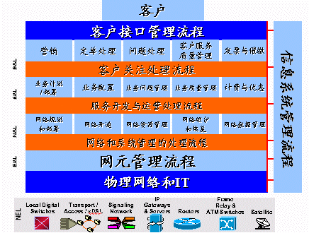 Assurance)的定義是,提供量化的測量指標,確保網(wǎng)絡(luò)服務能夠達到客戶所訂購的要求。(Service Usage)的定義是,測量電信網(wǎng)絡(luò)中各種業(yè)務的使用情況,計算處理使用電信業(yè)務的應收費用,并對電信業(yè)務的收費過程提供支持。這是從縱向的角度來看,而從橫向的角度來看,從電信管理的角度來看,OSS主要處在三個管理層面:客戶服務層;業(yè)務管理層;網(wǎng)絡(luò)管理層。