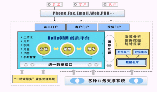 HollyCRM通過EAI與企業(yè)原有的業(yè)務(wù)系統(tǒng)充分整合,有效解決了阻礙企業(yè)內(nèi)部信息良性流轉(zhuǎn)的"信息孤島"現(xiàn)象。HollyCRM將分析型CRM產(chǎn)生的客戶價(jià)值和經(jīng)營分析結(jié)果實(shí)時(shí)反饋到運(yùn)營型CRM中,通過協(xié)作型CRM提供的接觸渠道,針對不同客戶提供個(gè)性化的營銷、銷售和服務(wù)活動。HollyCRM實(shí)現(xiàn)了整個(gè)企業(yè)信息的閉環(huán)、良性循環(huán)。