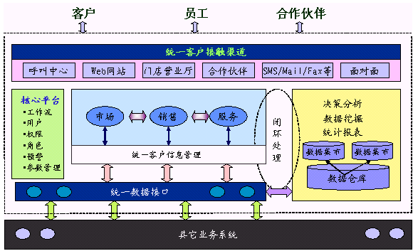 HOLLYCRM(合力金橋軟件公司)推出的HollyCRM是全面集成的客戶關(guān)系管理解決方案,覆蓋協(xié)作型CRM、運營型CRM和分析型CRM的全部范疇。HollyCRM通過telephone、Email、Fax、WAP、Web、PDA、Face to Face等各種各樣渠道與客戶互動,通過市場營銷(Marketing)、銷售(Sales)和服務(wù)(Service)等業(yè)務(wù)流程的管理,將客戶的各種背景信息、偏好、行為習慣、交易數(shù)據(jù)、信用狀況等信息收集并整合在一起,再將這些運營數(shù)據(jù)和外來的市場數(shù)據(jù)經(jīng)過整合和變換,裝載進數(shù)據(jù)倉庫(Data Warehouse)后,運用OLAP和數(shù)據(jù)挖掘(Data Mining)等技術(shù)來從數(shù)據(jù)中分析和提取相關(guān)規(guī)律、模型和趨勢,把有關(guān)客戶信息和知識在整個企業(yè)內(nèi)得到有效的流轉(zhuǎn)和共享,并進一步轉(zhuǎn)化為企業(yè)的戰(zhàn)略規(guī)劃和科學決策,用于提高在所有渠道上同客戶交互的有效性和針對性,把合適的產(chǎn)品和服務(wù),通過合適的渠道,在適當?shù)臅r候,提供給適當?shù)目蛻簦瑥亩鴮崿F(xiàn)利潤的最大化。