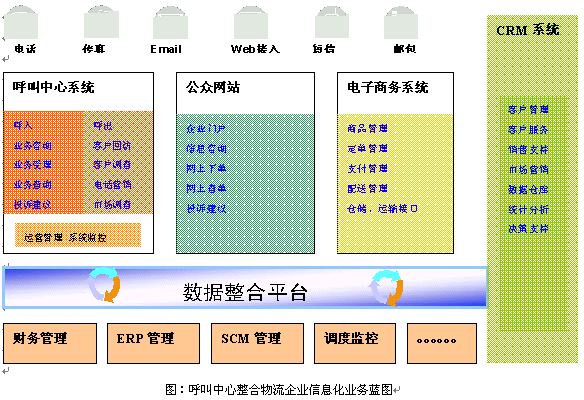 為解決傳統(tǒng)物流企業(yè)"成本高"、"效率低"的瓶頸問題,物流行業(yè)信息化目前已經(jīng)超越了關(guān)注和觀望,第一層次的信息化平臺在很多企業(yè)已經(jīng)實施,如內(nèi)部的財務(wù)管理、倉儲管理、定單管理、運輸管理等,相關(guān)系統(tǒng)包括ERP、物流管理(LM)、SCM等應(yīng)用系統(tǒng)。更進(jìn)一步,針對物流企業(yè)核心是提供"服務(wù)"這個概念,呼叫中心、電子商物、以及CRM技術(shù)的結(jié)合將對物流基礎(chǔ)信息平臺起到至關(guān)重要的整合作用: