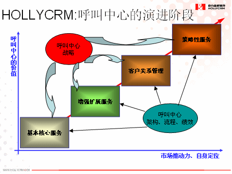 其次,我們認(rèn)為企業(yè)呼叫中心的建設(shè)不可能一次到位,而是一個(gè)持續(xù)改進(jìn)和不斷完善的過程。企業(yè)建設(shè)呼叫中心將是一個(gè)分階段分步驟的建設(shè)過程,將在其規(guī)劃的呼叫中心戰(zhàn)略的指引下和呼叫中心架構(gòu)、流程和績效的支撐上會經(jīng)歷基本核心服務(wù)、增強(qiáng)擴(kuò)展服務(wù)、客戶關(guān)系管理和策略性服務(wù)等幾個(gè)主要的階段,這就需要前期做好整體規(guī)劃,然后分階段實(shí)施,確保前期投資在后期依然可用就非常重要了,具體如下圖所示: