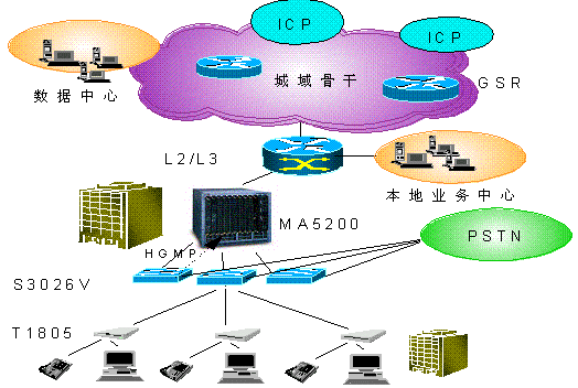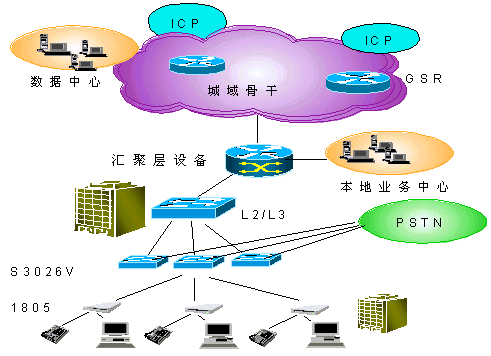 在用戶接入層Quidway S3026V提供24路VDSL接入,在普通雙絞線上提供12Mbps的雙向?qū)ΨQ數(shù)據(jù)業(yè)務(wù),傳輸距離最大可達(dá)1500m,在完成以太網(wǎng)接入的同時(shí),不影響POTS業(yè)務(wù)。S3026V上行FE接口直接接入L3交換機(jī)。同時(shí),通過雙絞用戶線完成了與PSTN交換機(jī)的相連,將寬帶、窄帶業(yè)務(wù)在S3026V上匯合,并通過已有雙絞電話線連接至遠(yuǎn)端用戶設(shè)備(1805)。1805可以通過五類線與計(jì)算機(jī)網(wǎng)卡相連。