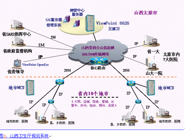 在山西省抗擊非典的關(guān)鍵時(shí)期,為了解決非典信息溝通不暢,資源整合不夠等問(wèn)題,山西省衛(wèi)生廳緊急組建視頻會(huì)議網(wǎng)絡(luò),要求能夠容納非典防治指揮中心、省疾病會(huì)議控制中心、省一大、省兒童醫(yī)院、山大一院、山大二院及衛(wèi)生廳領(lǐng)導(dǎo)、省委領(lǐng)導(dǎo)辦公室等十幾個(gè)非典防治重要部門,從整個(gè)政務(wù)往來(lái)看,系統(tǒng)要求具有高度穩(wěn)定性、良好的音視頻效果以及方便易用。經(jīng)測(cè)試,采用華為技術(shù)有限公司的ViewPoint
