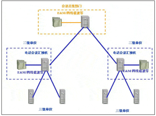 當前國內(nèi)許多行業(yè)由于行業(yè)的業(yè)務特點,在原有的電話網(wǎng)應用中,電話會議作為常用的交流手段發(fā)揮著重要作用。這些行業(yè)的電話會議業(yè)務,主要是通過電話會議匯接機的方式實現(xiàn):會議召集單位通過電話會議匯接機(以下簡稱匯接機)通過專線、撥號等方式連通下級單位(以下簡稱二級單位)的匯接機,二級單位的匯接機通過專線、撥號等方式連通所轄單位(以下簡稱三級單位)的會場電話。這樣通過多級匯接機級連的方式實現(xiàn),主持單位和二、三級單位間的電話網(wǎng)連通,利用匯接機實現(xiàn)廣播、三方通話、調度發(fā)言單位等會議功能。
