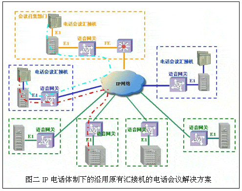 伴隨著IP網(wǎng)的建設和VoIP電話系統(tǒng)標準的日益完善,許多行業(yè)、部門開始在建設IP數(shù)據(jù)網(wǎng)的同時,結合原有電話專網(wǎng)的改造,著手建設IP電話網(wǎng)絡。在IP電話網(wǎng)上實現(xiàn)原有的電話會議業(yè)務也就隨之提到日程上來。華為公司結合IP電話的特點和保護用戶已有投資的角度,提出延用電話會議匯接機和采用華為專用IP電話會議控制系統(tǒng)兩套解決方案: