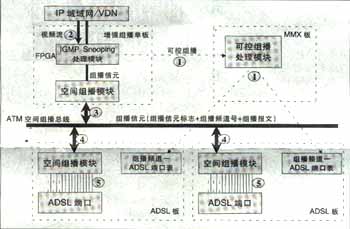 可實現(xiàn)高效的兩級組播;诳臻g總線上的組播信元技術(shù)實現(xiàn),與組播用戶數(shù)無關(guān),同一節(jié)目即使所有用戶加入該頻道,僅需復(fù)制一份,不用逐個用戶復(fù)制到每個用戶端口,極大節(jié)省了背板帶寬,減輕IP上行負(fù)擔(dān)。可實現(xiàn)高性能硬件組播轉(zhuǎn)發(fā)。IP上行板采用超大規(guī)模FPGA硬件邏輯處理組播報文,ADSL板采用空間組播處理硬件芯片自動完成向每個ADSL端口(用戶)的組播復(fù)制,每ADSL端口組播帶寬6M。