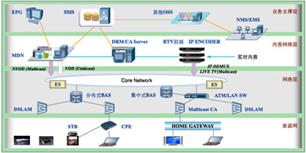 華為IPTV城域網(wǎng)解決方案,由業(yè)務(wù)支撐系統(tǒng)、內(nèi)容網(wǎng)絡(luò)系統(tǒng)、骨干承載網(wǎng)、接入網(wǎng)絡(luò)幾個部分組成。業(yè)務(wù)支撐系統(tǒng)和內(nèi)容網(wǎng)絡(luò)系統(tǒng)實現(xiàn)業(yè)務(wù)的管理和提供;網(wǎng)絡(luò)層和接入網(wǎng)以及用戶端設(shè)備配合完成業(yè)務(wù)的接入、控制、管理、QOS保障和安全。