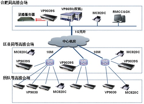 為滿足安徽省煙草合肥市公司日常工作會(huì)議、集中培訓(xùn)、遠(yuǎn)程匯報(bào)等工作業(yè)務(wù)需求,同時(shí)為應(yīng)對(duì)突發(fā)事件提供可靠可行的交互平臺(tái),實(shí)現(xiàn)多地點(diǎn)、遠(yuǎn)距離的視頻、音頻和數(shù)據(jù)的互通交流。深圳市金華威數(shù)碼科技有限公司工程師建議新建的視訊系統(tǒng)采用高清的視頻會(huì)議組網(wǎng)模式,其中市局、三縣與區(qū)局、所隊(duì)及營(yíng)銷(xiāo)部所有會(huì)場(chǎng)節(jié)點(diǎn)建設(shè)高清視頻會(huì)議系統(tǒng)。