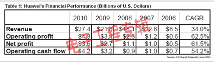 要想實(shí)現(xiàn)這個(gè)宏偉目標(biāo),該公司未來幾年必須快速擴(kuò)大營業(yè)收入。2010年華為的營業(yè)收入為274億美元,預(yù)計(jì)今年達(dá)到310億美元。
