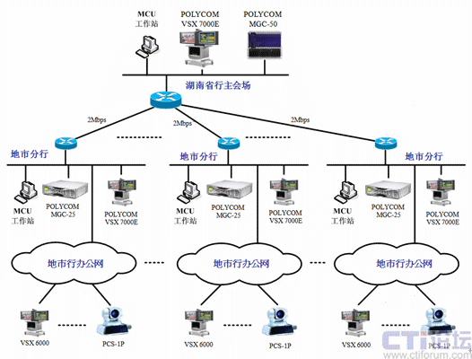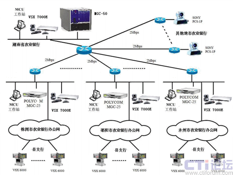 在株洲、邵陽(yáng)和永州市行采用級(jí)聯(lián)的方式來(lái)實(shí)現(xiàn)。具體實(shí)現(xiàn)方式為:VSX 7000E則和地市行的MGC-25通訊,并且MGC-25負(fù)責(zé)其縣支行終端的接入,同時(shí)用MGC-50和MGC-25的端口級(jí)聯(lián),采用這種連接方式就可以實(shí)現(xiàn)從省行-地市行-縣支行的三級(jí)網(wǎng)視頻會(huì)議的召開(kāi)。