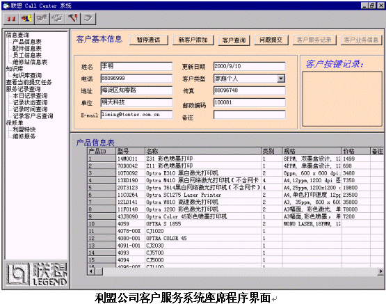 聯(lián)想神州數(shù)碼電子商務(wù)部于2000年7月承建利盟中國(guó)公司客戶(hù)服務(wù)中心系統(tǒng),該客戶(hù)服務(wù)系統(tǒng)可以為利盟全國(guó)的用戶(hù)提供產(chǎn)品、信息、價(jià)格、咨詢(xún)等服務(wù);服務(wù)方式包括人工、語(yǔ)音、傳真、郵件等。