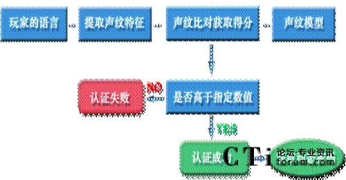 聲紋認(rèn)證是用戶通過電話至服務(wù)器端,服務(wù)器根據(jù)用戶注冊(cè)的聲紋來識(shí)別,通過認(rèn)證則為合法用戶,否則為非法用戶。認(rèn)證成功后,服務(wù)器端給予用戶一組動(dòng)態(tài)數(shù)字,再結(jié)合靜態(tài)密碼,這樣可大幅提高用戶在網(wǎng)絡(luò)游戲中的安全性。(如下圖)