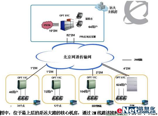新的網(wǎng)絡(luò)建成以遠(yuǎn)大路中心機(jī)房為核心的星形網(wǎng)絡(luò),租用北京網(wǎng)通2M專線的方式同各個(gè)門(mén)市店連接。各個(gè)門(mén)市店設(shè)立了自己的程控交換機(jī),并通過(guò)E1中繼方式和核心機(jī)房實(shí)現(xiàn)全網(wǎng)互聯(lián)。在此方案中,所有的市話呼入和呼出都通過(guò)核心節(jié)點(diǎn)同網(wǎng)通之間的中繼通道,從而實(shí)現(xiàn)大中電器內(nèi)部話音通訊的統(tǒng)一編號(hào)方案、統(tǒng)一撥號(hào)規(guī)則、統(tǒng)一維護(hù)和管理;并對(duì)外公布公開(kāi)和便于記憶的號(hào)碼,以配合網(wǎng)點(diǎn)的促銷(xiāo)活動(dòng),以及未來(lái)客戶服務(wù)等應(yīng)用的擴(kuò)展。