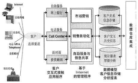 針對(duì)商業(yè)銀行面臨的挑戰(zhàn)和真實(shí)的需要,Oracle開發(fā)了面向銀行業(yè)的CRM解決方案。該解決方案提供全方位、統(tǒng)一的多渠道協(xié)同的客戶交互服務(wù)入口,包括網(wǎng)上自助服務(wù)、網(wǎng)上他助服務(wù)(通過(guò)Call Center在線指導(dǎo)客戶理財(cái)或提供投資建議)、電話自助服務(wù)、電話專家服務(wù)、電話智能市場(chǎng)推銷和銷售等,F(xiàn)場(chǎng)服務(wù)則提供客戶經(jīng)理與客戶面對(duì)面交流的能力,包括知識(shí)共享(金融市場(chǎng)信息、銀行產(chǎn)品信息和各業(yè)務(wù)部門發(fā)布的信息等)、銀行信息的及時(shí)獲取、產(chǎn)品和服務(wù)介紹、適時(shí)的投資建議、客戶交易行為追蹤、通過(guò)智能化工具提供專家服務(wù)、銷售機(jī)會(huì)管理等,允許重點(diǎn)客戶通過(guò)Web、電話或與客戶經(jīng)理/投資顧問(wèn)面談等方式,提供更靈活的服務(wù)選擇和更及時(shí)的服務(wù),以保留大客戶群,增長(zhǎng)股東利益。