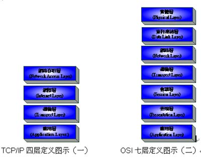 Standard Organization)所制定的標(biāo)準(zhǔn), 下面三層偏硬件,上面三層偏軟件,中間一層偏軟件硬件間的溝通。兩種標(biāo)準(zhǔn)協(xié)議圖(一)和圖(二)來(lái)作簡(jiǎn)單說(shuō)明.