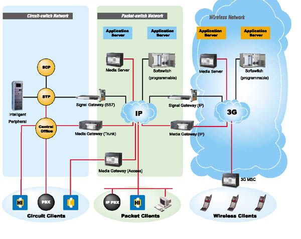 在下一帶網(wǎng)絡(luò)(NGN)中媒體網(wǎng)關(guān)在軟交換(softswitch)的控制下,將一種網(wǎng)絡(luò)中的媒體轉(zhuǎn)換成另一種網(wǎng)絡(luò)所要求的媒體格式。如媒體網(wǎng)關(guān)能夠在電路交換網(wǎng)的承載通道和分組網(wǎng)的媒體流之間進(jìn)行轉(zhuǎn)換,可以處理音頻、視頻或T.120,也具備處理這三者任意組合的能力,并且能夠進(jìn)行全雙工的媒體翻譯,可以演示視頻/音頻消息,實現(xiàn)其他IVR功能,同時還可以進(jìn)行媒體會議等。