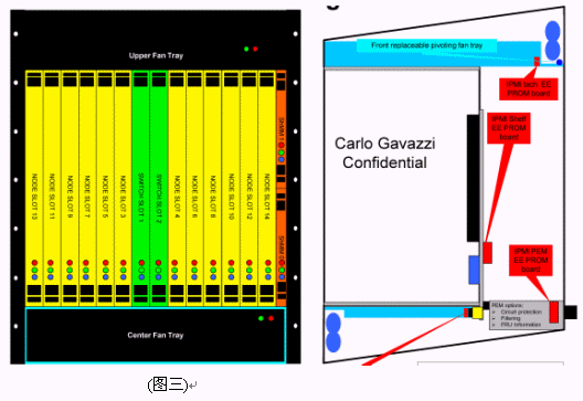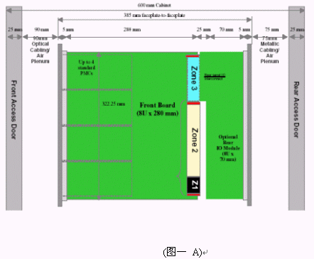 我們可以看到當(dāng)今市面上已有相關(guān)的零件商或系統(tǒng)商開發(fā)出14U或13U,12U的ATCA機(jī)箱。就ATCA機(jī)箱的型式來說可以分為直立型插卡與橫向型插卡兩種類型。直立式插卡機(jī)箱的標(biāo)準(zhǔn)為14槽(參考圖一B),而橫向型機(jī)箱因受限于機(jī)箱高度,所以視其高度決定槽數(shù)的多少。 ATCA的架構(gòu)主要包括以下部分:正面插槽,RTM,PEM,背板,CMMs,散熱系統(tǒng)。(參考圖一與圖二)