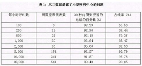 這張厄蘭表生動(dòng)地說(shuō)明了當(dāng)呼叫中心規(guī)模增長(zhǎng)是其效率的迅速增長(zhǎng)。這張表對(duì)應(yīng)的情況是這樣的:處理每一個(gè)呼叫的平均時(shí)間是2分鐘。要實(shí)現(xiàn)的目標(biāo)是90%的呼叫要在30秒內(nèi)得到應(yīng)答。第一列顯示了呼叫量的增長(zhǎng),第二列顯示了相對(duì)于特定的呼叫量,為達(dá)到指定的服務(wù)水平,在該厄蘭模型下所需的最少座席代表數(shù)。