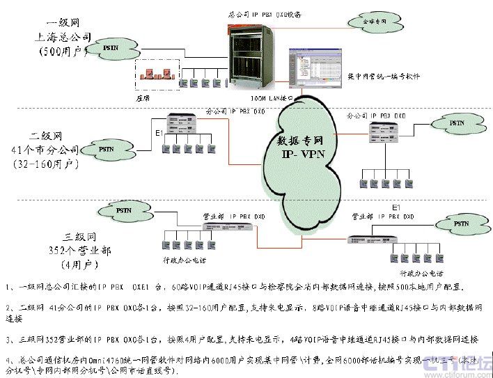 套Omni PCX Office(面向中小型機(jī)構(gòu)的通信平臺)系統(tǒng)分別為4-160 用戶作為分支交換節(jié)點(diǎn)。全網(wǎng)總計(jì)多達(dá)6000