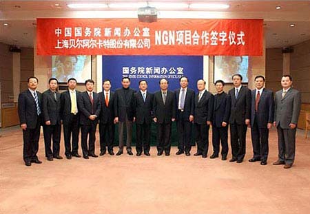 中國國務院新聞辦公室和上海貝爾阿爾卡特股份有限公司于3月28日就建設下一代通信網(wǎng)絡(NGN)在國務院新聞辦公室新聞發(fā)布廳舉行項目合作簽字儀式。