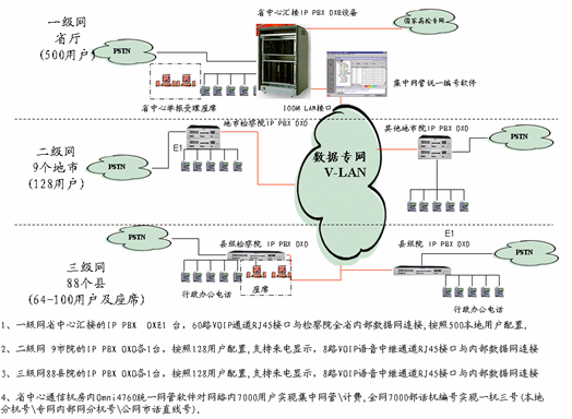 根據(jù)合同,阿爾卡特將提供1套Omni PCX Enterprise(面向大中型企業(yè)的通信平臺(tái))500用戶(hù)作為核心交換節(jié)點(diǎn),97套Omni PCX Office(面向中小型企業(yè)的通信平臺(tái))系統(tǒng)分別為60-160用戶(hù)作為分支交互節(jié)點(diǎn)。全網(wǎng)支持多達(dá)7000多個(gè)用戶(hù),覆蓋貴州省檢察院、9個(gè)地市檢察院和88個(gè)區(qū)縣檢察院。在設(shè)計(jì)組網(wǎng)方案時(shí),阿爾卡特根據(jù)用戶(hù)的需求和實(shí)際情況,并充分考慮現(xiàn)有的數(shù)據(jù)網(wǎng)絡(luò)資源,提出采用點(diǎn)對(duì)多點(diǎn)的網(wǎng)絡(luò)結(jié)構(gòu)建設(shè)VOIP語(yǔ)音網(wǎng)絡(luò),不僅可以充分保障通信的安全性和可靠性,同時(shí)還可最大限度保護(hù)現(xiàn)有投資,節(jié)省費(fèi)用。