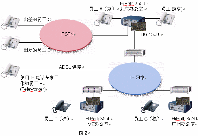 西門(mén)子推薦該公司每一個(gè)辦公室均采用HiPath 3550 PBX。如果,A公司每個(gè)辦公室已經(jīng)擁有DDN專線或ADSL連接至Internet,它就能將其內(nèi)部通信建設(shè)在現(xiàn)存的IP網(wǎng)絡(luò)的基礎(chǔ)之上。其集成網(wǎng)關(guān)HiPath 1500被用來(lái)連接數(shù)據(jù)網(wǎng)絡(luò)和語(yǔ)音網(wǎng)絡(luò)。在這樣的網(wǎng)絡(luò)架構(gòu)中,路由冗余能夠得到充足的保證,因?yàn)槲鏖T(mén)子HiPath解決方案提供了最大的網(wǎng)絡(luò)存活性:即使IP網(wǎng)絡(luò)出現(xiàn)故障,西門(mén)子網(wǎng)絡(luò)設(shè)置能夠?qū)⒙酚勺詣?dòng)切換至PSTN之上。
