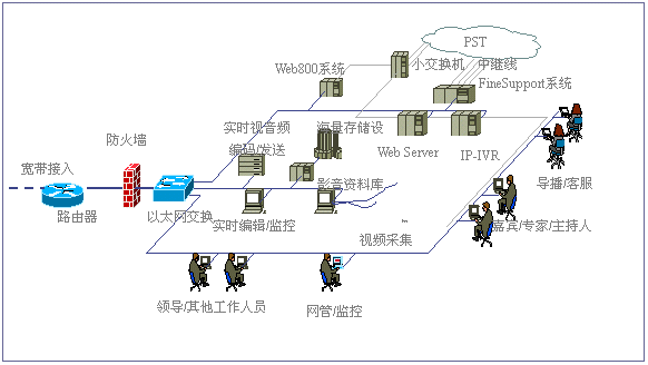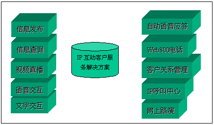 經(jīng)過(guò)對(duì)比分析,我們發(fā)現(xiàn),目前國(guó)際國(guó)內(nèi)市場(chǎng)上很多客戶服務(wù)產(chǎn)品,大都僅僅完成客戶服務(wù)的一部分。北極星“IP互動(dòng)客戶服務(wù)中心解決方案”則引入互動(dòng)客戶服務(wù)(ICS:Interactive Customer Service)系統(tǒng)以及數(shù)碼互動(dòng)直播的概念,形成了由視頻點(diǎn)播、網(wǎng)上路演、語(yǔ)音和文字交互、IP客戶服務(wù)中心、Web800語(yǔ)音電話、實(shí)時(shí)服務(wù)中心、專(zhuān)家實(shí)時(shí)在線、客戶關(guān)系管理、在線尋呼系統(tǒng)和客戶社區(qū)服務(wù)系統(tǒng)等全方位的服務(wù)內(nèi)容。該方案主要基于IP架構(gòu),系統(tǒng)擴(kuò)展性非常靈活,系統(tǒng)體現(xiàn)的客戶服務(wù)思想非常能夠滿足我們的需求。2001年3月,經(jīng)過(guò)一段時(shí)間的試運(yùn)行后,我們正式推出了這套“IP互動(dòng)客戶服務(wù)”系統(tǒng)。