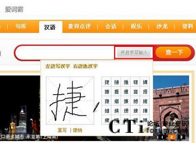 打開(kāi)金山軟件公司的愛(ài)詞霸漢語(yǔ)網(wǎng)站,點(diǎn)擊 “開(kāi)啟手寫(xiě)輸入”選項(xiàng),進(jìn)入手寫(xiě)輸入框界面,輸入框簡(jiǎn)潔清爽,用戶可通過(guò)鼠標(biāo)取代鍵盤(pán)和手寫(xiě)板,自由在搜索框中輸入關(guān)鍵字。