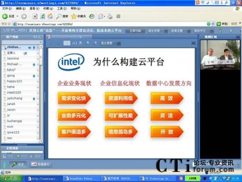 2011年3月25日,intel攜手V2威速租用型視頻會議,針對構(gòu)建云計算平臺,展開了一場主題為“找到云的“高低”——開放架構(gòu)支撐高靈活、低成本的云平臺”別開生面的線上研討會。在此之前,V2威速租用型視頻會議曾多次攜手intel、EMC、APC、SAP等成功開展線上研討會;顒拥某晒εe辦為intel提供了一個良好的與客戶交流溝通的平臺。