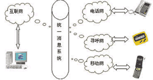 UMS可以將電子郵件、語音、尋呼、移動短消息、傳真和多媒體數(shù)據(jù)等所有信息類型集合為一個信息,并可用電話、傳真、手機(jī)、呼機(jī)、PC、掌上電腦、PDA等通信設(shè)備中的任何一種接收,在有線、無線、互聯(lián)網(wǎng)之間架構(gòu)起一個信息互聯(lián)通道(如圖)。統(tǒng)一信息系統(tǒng)(Unified