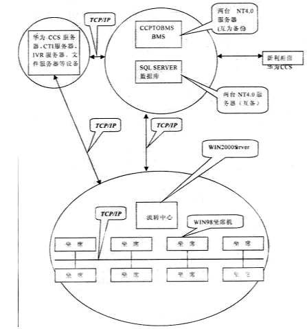 系統(tǒng)采用總部集中模式,前臺運行信雅達通訊轉接程序(CCPTOBMS)和信雅達業(yè)務處理程序(BMS)。通訊轉接程序從華為接入平臺接收各類業(yè)務請求,再轉發(fā)至業(yè)務處理程序。業(yè)務處理程序與新利處理中心通訊,將各類業(yè)務請求分類處理。后臺數據庫選用兩臺服務器安裝SQLSERVER7.0,使用OCTOPUS進行數據備份。
