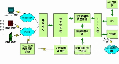 本系統(tǒng)實(shí)現(xiàn)接警、處警功能。接警中心統(tǒng)一接聽和處理市民的報(bào)警、求助電話,市民可以通過電話撥打110、119、120、122等緊急特服號(hào)碼或只撥打統(tǒng)一的特服號(hào)碼(或通過Internet方式)向系統(tǒng)求助;處警中心接收接警中心轉(zhuǎn)發(fā)的警情數(shù)據(jù),并借助地理信息系統(tǒng)的定位、空間分析功能,對(duì)所有的資源和警力通過一體化的數(shù)據(jù)傳輸和通訊調(diào)度臺(tái)進(jìn)行方便的統(tǒng)一管理、指揮和調(diào)度。