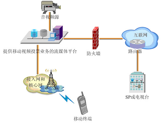 移動流媒體系統(tǒng)是移動視頻投票的中樞模塊,音視頻輸入源直接將音視頻信息傳送到移動流媒體平臺,由移動流媒體平臺分發(fā)到視頻投票手機,讓用戶觀看現(xiàn)場音視頻狀況。視頻投票手機通過按鍵操作向移動流媒體平臺發(fā)送投票指令,移動流媒體平臺將投票指令發(fā)送給SP或電視臺完成投票,并根據(jù)投票是否被SP或電視臺接受從而完成計費。移動流媒體平臺還會被動從SP或電視臺獲取選手介紹等文本信息、投票統(tǒng)計信息等,然后將這些信息顯示在視頻投票移動終端上。