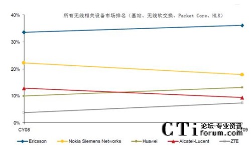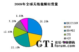 CTI論壇(ctiforum)4月16日消息(記者 潘婷婷): 近日,業(yè)內(nèi)著名調(diào)研公司Infonetics發(fā)布了2009年全球無線通信設備市場研究報告《2G/3G Mobile Infrastructure and Subscribers》。根據(jù)報告顯示,2009年全年,全球無線通信市場份額出現(xiàn)了較大變化,按載頻計,中興通訊全年以12.6%的全球市場份額超越阿爾卡特-朗訊,居行業(yè)第4,按載頻計,2009年全球無線設備出貨市場份額排名為愛立信、華為、諾基亞-西門子、中興、阿爾卡特-朗訊,分別為28.2%,22.1%,19%,12.6%和9.2%。