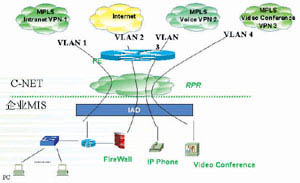 VPN中,實(shí)現(xiàn)業(yè)務(wù)在VLAN 和VPN中的無(wú)縫對(duì)接,以保證用戶(hù)數(shù)據(jù)的安全、高效傳輸;接入網(wǎng)采用基于RPR或SDH的MSPP環(huán)實(shí)現(xiàn)IP業(yè)務(wù)和TDM業(yè)務(wù)的綜合傳輸;在商業(yè)樓宇內(nèi)主要采用IAD設(shè)備將客戶(hù)的數(shù)據(jù)、語(yǔ)音、專(zhuān)線(xiàn)等業(yè)務(wù)接入CNC