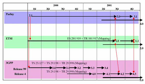 1998年4月,Parlay工作組成立,成員主要有英國電信、Ulticom 、微軟 、北電 、西門子組成,并于1998年12月出版提出最初的版本。Parlay工作組的目標是通過規(guī)范開放應用程序接口,聯(lián)合IT應用和通信應用的開發(fā)能力,促使通信應用數(shù)量的飛速發(fā)展。1999年5月,隨著AT&T、Cegetel、Cicso、Ericsson、IBM和Lucent等6個新成員的加入,成員總數(shù)增加至共11名。2000年1月API2.0出版,僅6個月后,API2.1出版。在2001年2月,Parlay工作組成員增加至37個,并推出Parlay3.0。Parlay