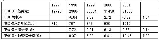 盡管電信運營業(yè)存在投資過度,并導致巨額虧損,但是過去幾年世界電信收入的增長率高于GDP,平均為7.8 3%,顯示出電信運營業(yè)仍呈現(xiàn)出強勢發(fā)展特征。表中的數(shù)據(jù)表明:電信業(yè)仍是經(jīng)濟中最具增長力量的部分。