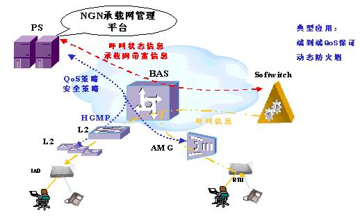 所有用戶接入BAS,BAS通過CAR可以對不同的用戶限制帶寬,PC分配較低的優(yōu)先級及帶寬,而對IAD分配較高的優(yōu)先級和帶寬,防止普通用戶對帶寬的無節(jié)制濫用。PS可以動態(tài)收集BAS設(shè)備的帶寬使用情況,同時通過與軟交換的交互,了解NGN業(yè)務(wù)的帶寬需求,從而在BAS上可按用戶及業(yè)務(wù)的粒度進行動態(tài)QoS策略配置,為用戶提供差異性業(yè)務(wù),保證用戶的SLA。PS可以下發(fā)QoS策略給BAS,BAS交換機可以進一步通過協(xié)議(各廠家私有協(xié)議)下發(fā)QoS策略給下掛的L2交換機。