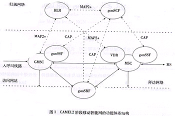 在移動通信領(lǐng)域,歐洲電信標(biāo)準(zhǔn)學(xué)會(ETSI)制定的CAMEL系列標(biāo)準(zhǔn)為基于GSM移動通信網(wǎng)絡(luò)的移動智能網(wǎng)提供了統(tǒng)一的規(guī)范。其中CAMEL2階段的標(biāo)準(zhǔn)符合ITU-T的IN CS-1,支持各種基于語音的智能業(yè)務(wù)。CAMEL2階段移動智能網(wǎng)的功能體系結(jié)構(gòu)如圖1所示。CAMEL3階段的標(biāo)準(zhǔn)基于CS-2,主要增加了對GPRS移動數(shù)據(jù)業(yè)務(wù)以及短消息業(yè)務(wù)的支持。