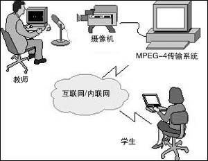 對于需要上課的學生,可以利用MPEG-4交互教學系統,在自己的家里觀看教師講課,不但能看到教師,還可以同步看到教師計算機屏幕上的講義。如果在學生家里的計算機上安裝了麥克風和攝像頭,還可以進行視頻交流,“面對面的”溝通。學生可以“舉手”回答老師的問題,學生之間可以討論,老師可以進行網上測驗。