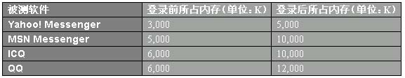 在使用Windows平臺(tái)下的PC也只有內(nèi)存還稍顯珍貴,所以就這四款軟件所占用的內(nèi)存進(jìn)行了對(duì)比。結(jié)果如下:Yahoo! Messenger所占的內(nèi)存,無(wú)論在登錄前后都是最小的;第二名,MSN Messenger在功能龐大的情況下,能做得如此精巧實(shí)屬難得;第三名,ICQ從2000版開始對(duì)內(nèi)存的占用始終比較穩(wěn)定,只是在出了中文界面后稍高一些;第四名,QQ啟動(dòng)出現(xiàn)登錄界面時(shí)還沒(méi)顯出味口有多大,不想登錄后隨著系統(tǒng)信息和Flash廣告等傳到客戶端占用內(nèi)存的峰值竟然能達(dá)到15,000K,相信內(nèi)存小一些的機(jī)器在QQ登錄后就要多等一會(huì)兒了。