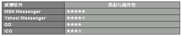 對(duì)于IM類軟件來(lái)說(shuō),網(wǎng)友希望其界面在精美的同時(shí)越簡(jiǎn)單越直接越好。在這一點(diǎn)上,MSN Messenger最為突出,界面精致,操作極易上手,在本次評(píng)測(cè)中獲得一致認(rèn)可,位列第一;Yahoo! Messenger操作上也比較直觀,只是“做工”顯得有些粗糙;被測(cè)的QQ2003剛剛在界面上做了重大的改變,只是稍顯零亂,對(duì)MSN的部分借鑒比較成功,對(duì)于一個(gè)新用戶來(lái)說(shuō)最基本的功能的使用還算方便;ICQ功能的確強(qiáng)大,界面有些老舊,(ICQ Lite可以改變這一切,但是ICQ Lite僅僅是ICQ的一個(gè)插件版本,本次評(píng)測(cè)沒(méi)有考慮),ICQ操作對(duì)中文用戶來(lái)說(shuō)也過(guò)于繁復(fù)。