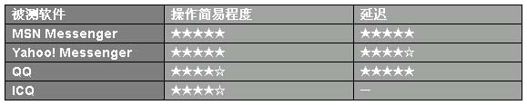 MSN Messenger和Yahoo! Messenger的操作都很簡(jiǎn)單,只是MSN Messenger在同樣的畫質(zhì)下延遲要小于Yahoo! Messenger,表現(xiàn)出更優(yōu)的實(shí)用性。QQ操作也不算太復(fù)雜,只是會(huì)員和非會(huì)員在功能上有一些限制,不過(guò)在同畫質(zhì)的延遲方面做的算是出色,ICQ操作沒(méi)有測(cè)試成功。