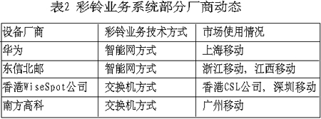 目前市場上有技術(shù)能力提供彩鈴業(yè)務(wù)系統(tǒng)的廠商主要有韓國的設(shè)備商Witcom和 OnionTech21,以及其他國外廠商如Comverse和WiseSpot,國內(nèi)廠商有華為、中興、南方高科、東信北郵等。各廠商都在和移動運(yùn)營商合作部署其彩鈴業(yè)務(wù)系統(tǒng),力爭成為市場的領(lǐng)先者,如華為在上海移動建設(shè)了其智能網(wǎng)方式的彩鈴業(yè)務(wù)系統(tǒng),通過其原有的智能網(wǎng)系統(tǒng)的更新升級實(shí)現(xiàn)彩鈴業(yè)務(wù)。現(xiàn)在已有確切消息證實(shí),彩鈴業(yè)務(wù)將于今年10月1日起正式商用,同時進(jìn)入商用的還有北京移動的彩鈴業(yè)務(wù)。與此同時,東信北郵也與浙江移動、江西移動合作開通彩鈴業(yè)務(wù),于2003年3月25日彩鈴業(yè)務(wù)通過現(xiàn)網(wǎng)實(shí)用測試。