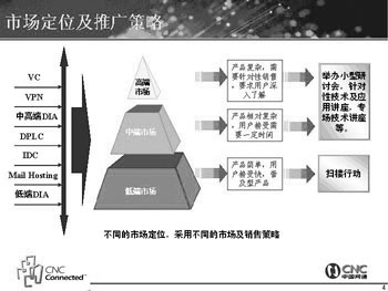 為了打開網(wǎng)通視訊業(yè)務(wù)的局面,網(wǎng)通的推廣方案也非常完備,這位負責(zé)人向記者出示了一張圖(見左下圖),詳細地解釋了網(wǎng)通視訊業(yè)務(wù)的市場定位及推廣策略。首先是通過媒體宣傳給客戶以整體印象,力求覆蓋面廣,眾所周知; 接著以直郵形式有針對性地發(fā)放詳細單頁資料,深入宣傳;然后以小型研討會、技術(shù)講座等形式,有針對性地召集當(dāng)?shù)啬繕?biāo)客戶/潛在用戶,細論VC市場及產(chǎn)品; 最后是以巡展、樣板客戶案例造聲勢,提高產(chǎn)品形象。