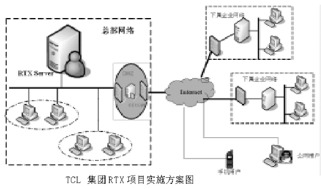 在RTX項目的實施上,TCL集團公司專門購置了一臺P4 2.4G,256M,40G的高配置服務器作為RTX Server(如圖),安裝在集團公司的總部網絡上,同時連接到集團公司的專線上,并分配外部IP地址,供異地員工登陸到服務器。整個RTX實施方案如圖1所示:在硬件方面,只添加一臺RTX Server作為IM服務器,無需對現(xiàn)有網絡作大規(guī)模改動;在軟件方面,在RTX Server上安裝最新的服務器端軟件RTX 3.2版本,使用RTX的集團員工自行下載安裝RTX客戶端,客戶端能傻瓜式在線更新。