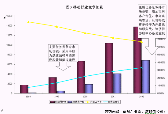拿移動(dòng)通訊業(yè)務(wù)來說,如圖3所示,截至到2002年底,中國移動(dòng)的市場份額大約在65%,而聯(lián)通為35%左右,網(wǎng)絡(luò)覆蓋以及質(zhì)量也越來越趨同。從國內(nèi)國外的經(jīng)驗(yàn)來看,移動(dòng)通訊市場的競爭正從爭奪市場份額轉(zhuǎn)變?yōu)楸3质袌龇蓊~和增加客戶價(jià)值,而主要手段正也從網(wǎng)絡(luò)建設(shè)、營銷渠道建設(shè)、價(jià)格戰(zhàn)等轉(zhuǎn)變?yōu)楫a(chǎn)品戰(zhàn)和服務(wù)戰(zhàn)。在這個(gè)階段,兩家主要的運(yùn)營公司都對客戶服務(wù)非常重視。服務(wù)水平的達(dá)標(biāo),投訴流程的梳理,呼叫中心的擴(kuò)大規(guī)模,電話營業(yè)廳的建設(shè)等工作是今年的重點(diǎn)。