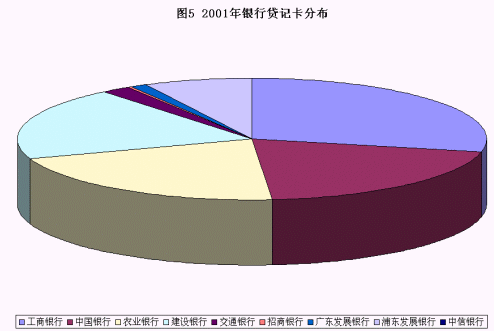 以貸記卡(含信用卡)的發(fā)展舉例:四大國有銀行在2001年還占據(jù)了絕大部分的份額(圖5是2001年貸記卡的分布)。而從2002的下半年起,深圳發(fā)展銀行、招商銀行陸續(xù)推出了頗具市場競爭力的信用卡,廣東發(fā)展銀行等老發(fā)卡行也推出獨(dú)特的女性專用"真情卡"等個(gè)性化產(chǎn)品,對整個(gè)市場有著很大的沖擊。在信用卡發(fā)卡量迅速提升的情況下,工商銀行2002年貸記卡的數(shù)量比前一年減少了160萬張,這也說明了市場競爭的殘酷。