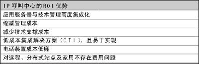 為盡量縮減成本,企業(yè)主管們都在想方設(shè)法引入新型通信技術(shù)改造呼叫中心。IP呼叫中心的ROI優(yōu)勢在于:應(yīng)用服務(wù)器與技術(shù)管理高度集成化;縮減管理成本;減少技術(shù)支撐成本;低成本集成解決方案(CTI),且易于實現(xiàn);電話裝置成本低廉;對遠(yuǎn)程、分布式站點及家用不存在費用問題。